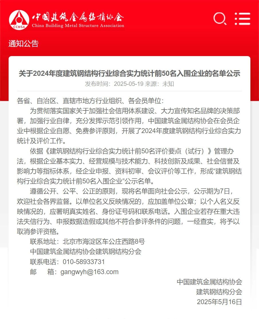 為貫徹落實國家關(guān)于加強社會信用體系建設、大力宣傳知名品牌的決策部署,加強行業(yè)自律,充分發(fā)揮示范引領(lǐng)作用,中國建筑金屬結(jié)構(gòu)協(xié)會在會員企業(yè)中根據(jù)企業(yè)自愿、免費參評原則,開展了2024年度建筑鋼結(jié)構(gòu)行業(yè)綜合實力統(tǒng)計及評價工作。依據(jù)《建筑鋼結(jié)構(gòu)行業(yè)綜合實力統(tǒng)計前50名評價要點(試行)》管理辦法,遵循公開、公平、公正的原則,根據(jù)企業(yè)基本實力、經(jīng)營規(guī)模與技術(shù)能力、科技創(chuàng)新及成果、社會信譽及影響力等指標體系,經(jīng)企業(yè)申報、資料初審、會議評價等工作,形成“建筑鋼結(jié)構(gòu)行業(yè)綜合實力統(tǒng)計前50名入圍企業(yè)”公示名單。